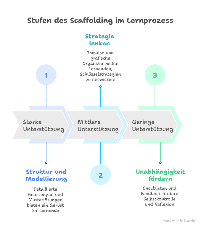 Die dritte Säule ist das Herzstück der Differenzierung durch Unterstützung: die passgenaue, flexible Bereitstellung von Hilfen, die es jedem Lernenden ermöglichen, am gemeinsamen Ziel zu arbeiten. Scaffolding bedeutet nicht, Aufgaben zu vereinfachen, sondern Hürden durch passende Stützen zu überbrücken. Die Unterstützung erfolgt idealerweise in drei klar definierten Stufen: