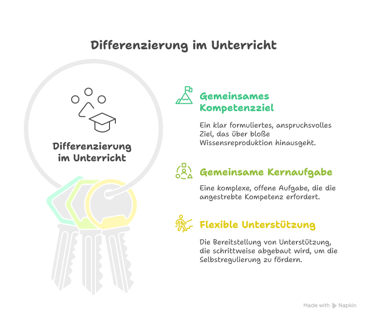 Um die Differenzierung durch Unterstützung erfolgreich in die Praxis umzusetzen, bedarf es einer Neukonzeption von Unterricht. Dies basiert auf drei essenziellen Säulen: