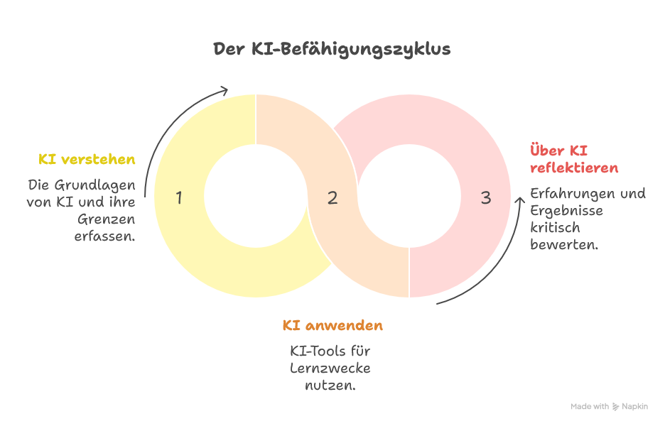 Eine Lernspirale statt einer Linie: Diese drei Ebenen – Verstehen, Anwenden und Reflektieren – folgen keinem linearen Ablauf, sondern bilden eine Lernspirale. Jede neue Erfahrung mit KI führt zu neuem Verständnis; jedes vertiefte Verständnis verändert die Art der Anwendung; jede Reflexion schärft das Urteilsvermögen für den nächsten Schritt. So entwickelt sich nach und nach eine reflektierte, souveräne Nutzung von KI: Lernende lernen, mit der Maschine zu denken, aber nicht wie sie.