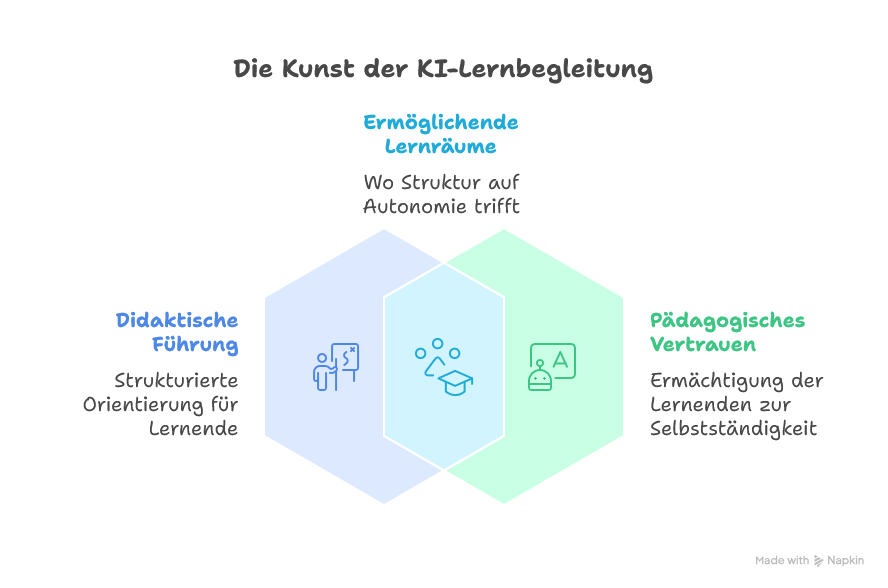 Zwischen didaktischer Führung und pädagogischem Vertrauen liegt die eigentliche Kunst. Diese Balance herzustellen ist anspruchsvoll, aber entscheidend: Zu viel Kontrolle erstickt Neugier, zu viel Freiheit überfordert. Erst das bewusste Wechselspiel beider Haltungen ermöglicht eine Lernkultur, in der KI als Ressource wirklich fruchtbar werden kann – jenseits von Verbot und Euphorie. Lehrkräfte werden damit zu Architektinnen eines neuen Lernraums: eines Raums, in dem Lernen mit KI nicht durch starre Regeln begrenzt, sondern durch kluge Gestaltung ermöglicht wird. Ein Raum, in dem Denken wichtiger bleibt als Technik – und Vertrauen zur Voraussetzung jedes Lernens wird.