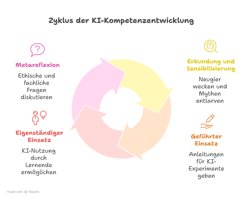 Damit Lernende die nötigen Kompetenzen im Umgang mit KI aufbauen können, braucht es Lernumgebungen, die diesen Prozess gezielt unterstützen. KI-Kompetenz entsteht nicht durch einmalige Inputs oder Tool-Schulungen, sondern durch begleitetes Erkunden, Ausprobieren und Reflektieren. Der Weg führt also von der angeleiteten Nutzung hin zur eigenständigen, verantwortlichen Gestaltung. Ein solches Lernen lässt sich gut in vier Phasen denken, die nicht starr aufeinander folgen, sondern sich überlappen und immer wieder neu durchlaufen werden können.